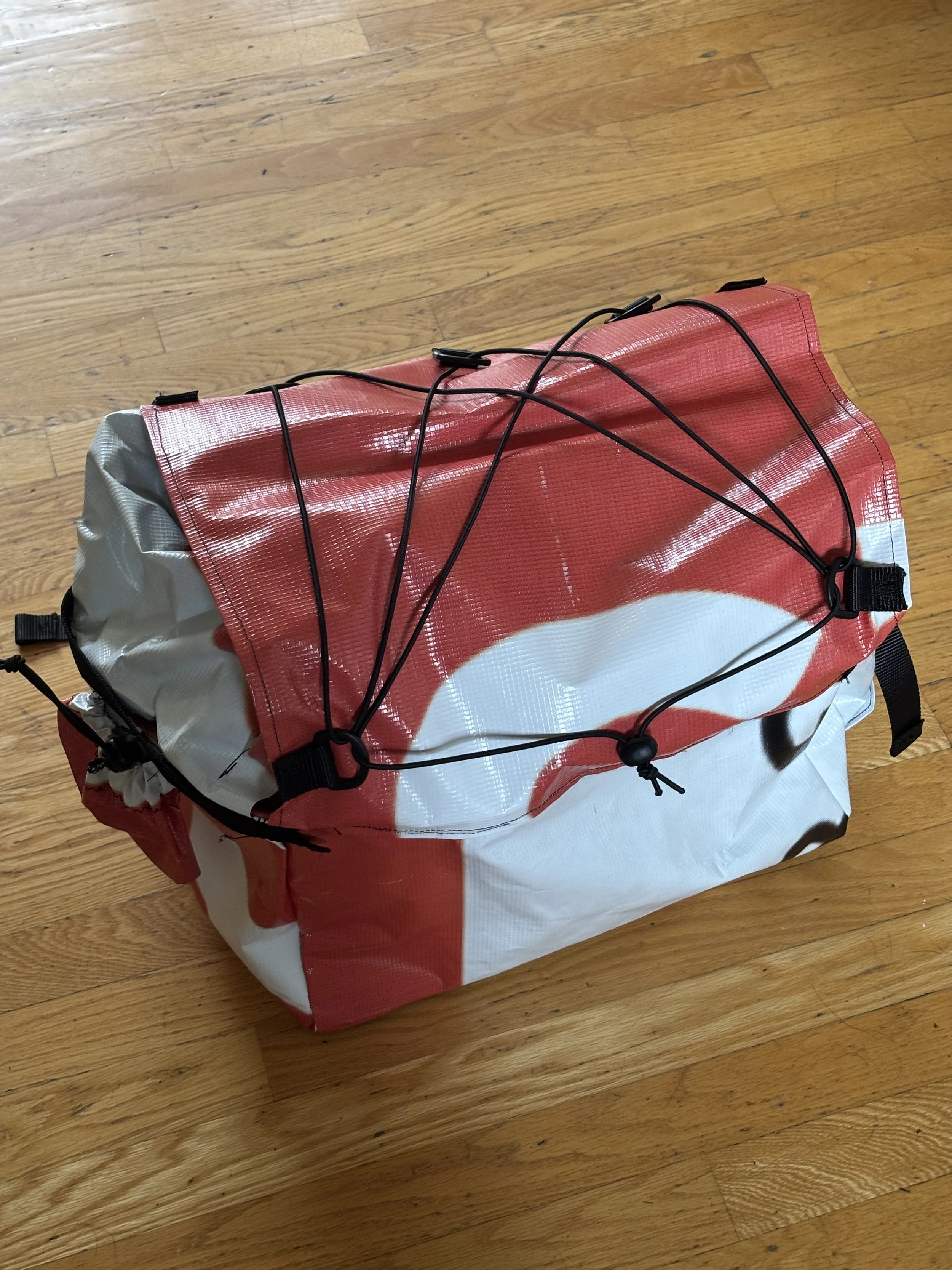 This bike bag was made of repurposed billboard vinyl. Custom made to directly connect to the rider’s front cargo platform, this bag will carry all the essentials for an extended bike packing trip.